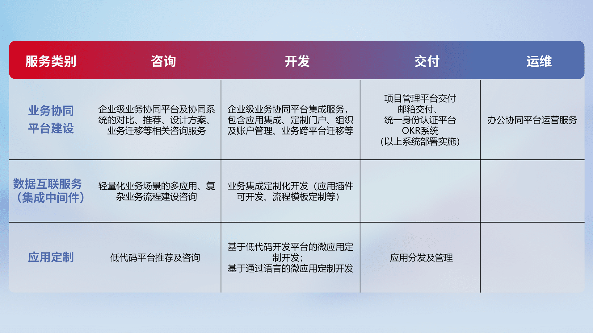 针对钉钉、、、、企微、、IDaas等平台级产品提供产品的规划、、、、方案、、交付、、定制化开发等服务,,实现如统一协同办公、、、智能客户服务、、混合会议管理、、、智能数据查询、、等业务场景,,,,实现数字化转型。。