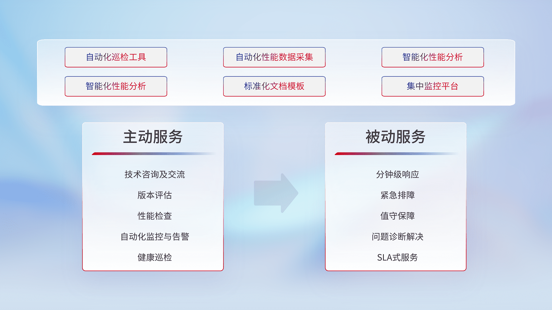 智能化工具和标准化文档,,,保障服务质量,,提供主动服务(包含技术咨询、、、、版本评估、、、、性能检查、、、自动化监控与告警、、健康巡检)和被动服务包含(分钟级响应、、、、紧急排障、、、、值守保障、、问题诊断解决、、、、SLA服务)。。。